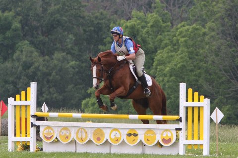 Well, lookee here, straight ahead, nice square oxer and I’ve got a nice canter going.  What a bonus.  One stride later it dawns on me that there is no ground line on this side of it, and it isn’t square, it is slightly ascending, from the other side.  At moments like this I tend to simply keep doing what I’m doing and think at light speed.  So in the next stride, the thoughts that went through my head were: 1) I should pull him off, that is obviously not the right fence; and 2) but this is a really fab canter and the distance is perfect, it will sail; and 3) he’s a relatively green horse and this is a schooling show, so I don’t want to pull him off and give him a jar; and 4) he’s a relatively green horse so I should not ask him to jump a ground line-less descending oxer; and finally came to the conclusion 5) hell with it, Lucinda Green jumps ascending oxers backwards as a matter of course in her training and Sammy’s been jumping bigger than this without a groundline at home and what does he care if it is a descending oxer, he’ll land 8 feet on the other side anyway.