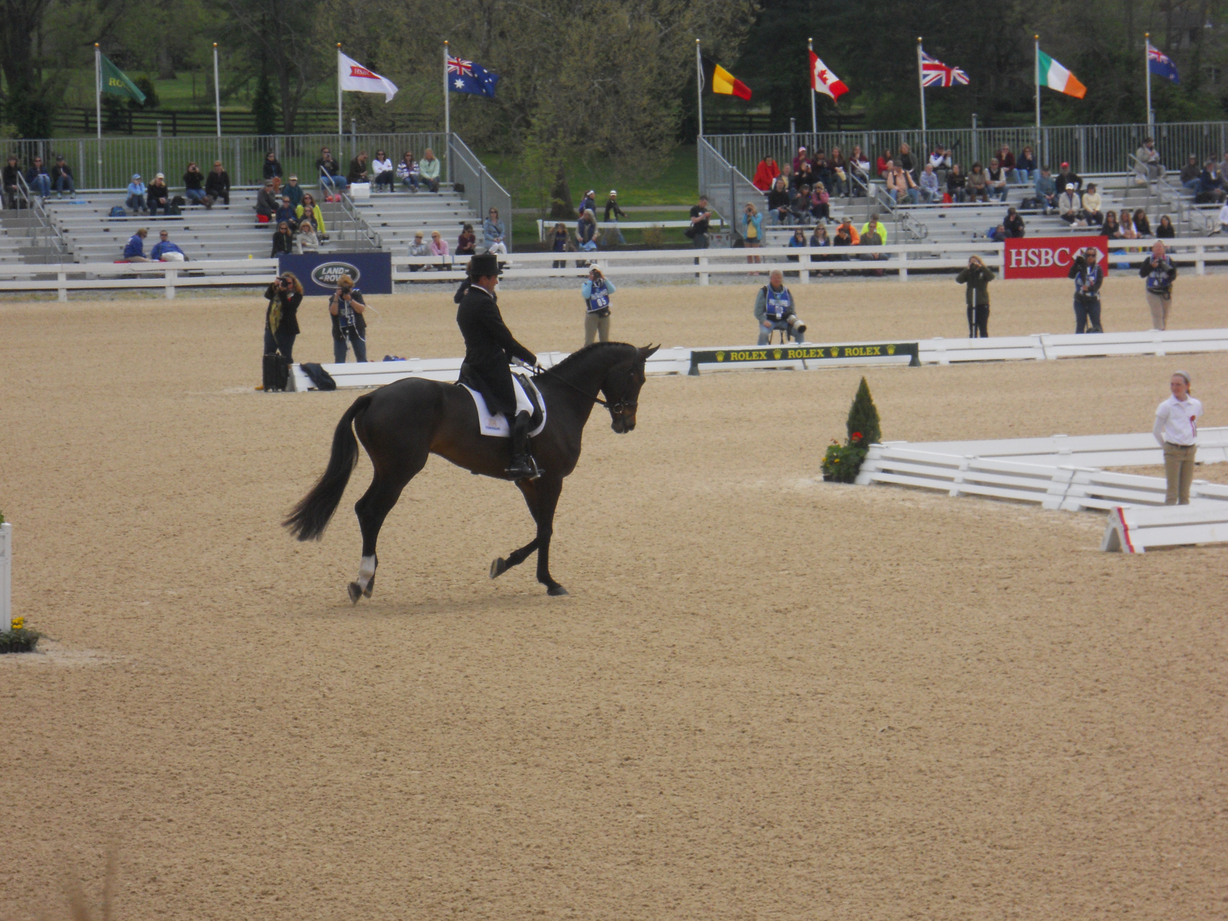 Dressage Day at Rolex had us arriving at the park at 7:30 a.m., in the hope that the trade fair would be open before dressage started at 10. This is how the head of the lake looked at 7:30 in the morning on our walk in. How cool.